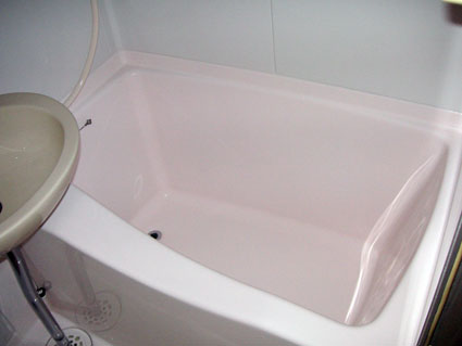 広く見えるようにオフホワイトの単色での塗装も考えたのですが、オーナー様に2色のカラーリングを提案させていただき、オフホワイトの壁、天井。そして淡いピンクで浴槽と床をコーティングしました。