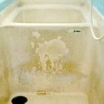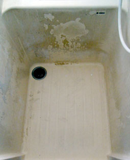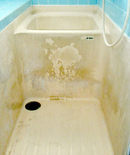 このタイプは古いアパートやマンションで今でも現役で使われています。 今回は劣化の激しいハーフユニットバスの浴槽のコーティング例です。まずは施工前からです。