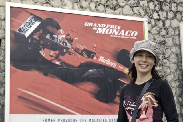 モンテカルロ市内で大好きなフェラーリの看板の前で我が女王陛下。