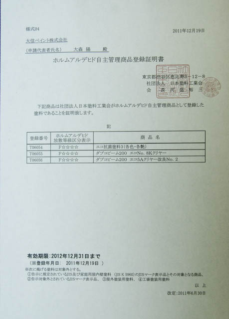 先週、待ちに待ったF☆☆☆☆の認定書が届きました。これで胸を張って仕事に何の気遣いも無く打ち込めます。浴室塗装(コーティング)の業界ではほぼ、どの独立系のメーカーでも取得していないでしょう。これでホルムアルデヒドとはおさらばです。リプロの塗料(コーティング材は前々からこの基準をクリアーしていました。)