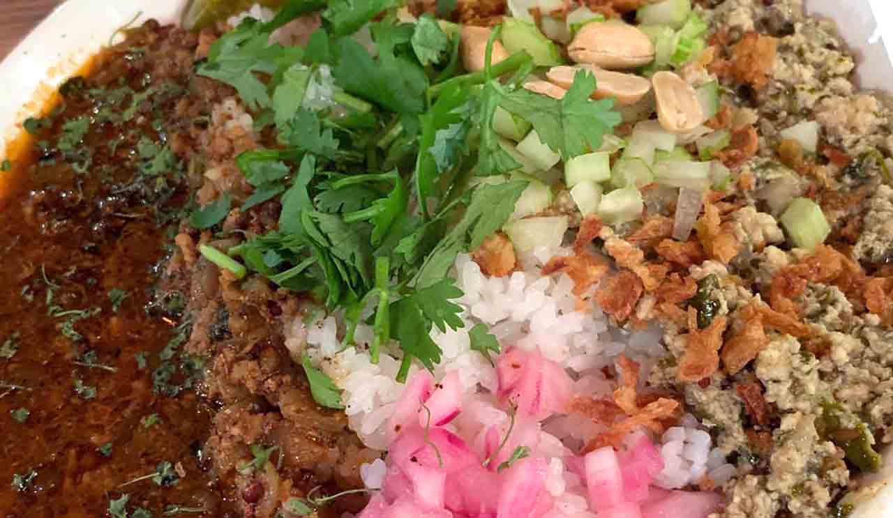 おすすめは元祖?和出汁のニボ醤油ポークキーマとエビ塩チキンキーマのあいがけに石井煮玉子とスパイスメンマの組み合わせで堪能できます。