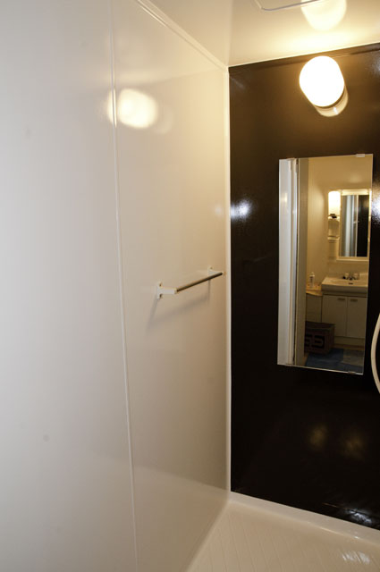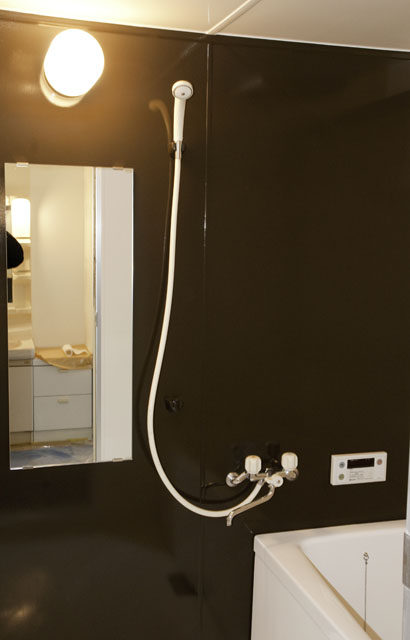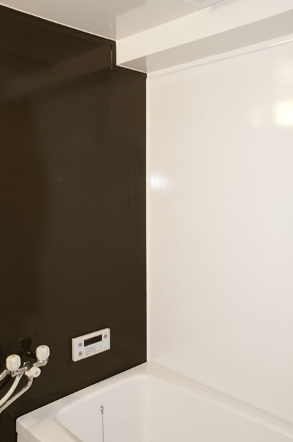 昨日社内検査も合格したユニットバスのコーティングです。前回から書いている通り奥のパネルを焦げ茶色でコーティングしました。2色使いで高級感有りです。壁に浴室用のパネルを貼る方法もあるのですが、少しでもローコストを実現するために塗装してみました。