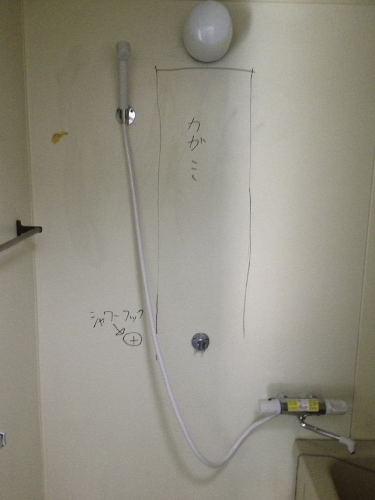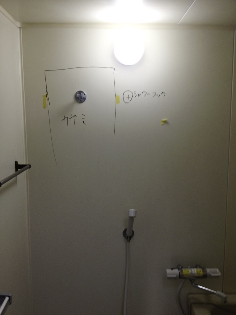 付ける場所は限られているのですが朝から浴室はコーティングする前に下地処理をするのでペンでアタリをつけてシミュレーションしました。