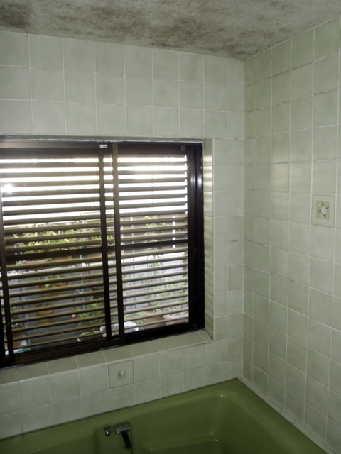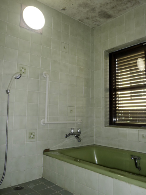 タイルの壁自体はひどく痛んでいる訳では無いのですが、天井はカビだらけです。床のタイルは床シートでリフォームする事に依って冷たさからは解放されます。