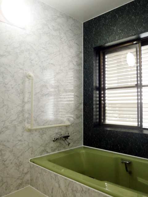 浴槽はそのままでよいと言われていたので浴槽の黄緑色を活かし、アクセントに濃い緑色を蛇紋石のパターンでそれ以外をライトグレーで提案させて頂きました。
