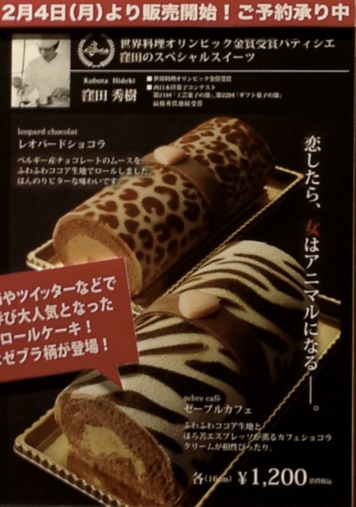 待望の新阪急ホテルの喫茶ブリアンであの有名なパティシエ窪田秀樹さんのバレンタインケーキの販売が2月4日から始まります。窪田秀樹さんのロールケーキと言えばアニマル柄で有名です。
