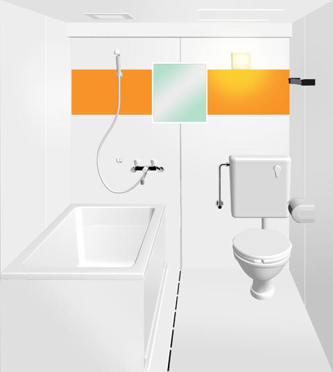 管理会社様から浴槽のエプロンの色目が悪いので塗り替えて、なおかつオレンジ色をどこかに入れて欲しいとの注文でした。現地で正面の壁にラインを入れてみましょうと提案させて頂きました。