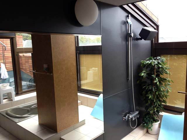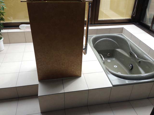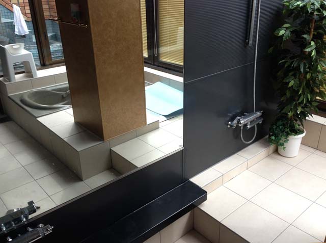 床の色とマッチして良い感じになっています。ここまで大きなお風呂を施工するのは奈良の観光旅館に続き2回目ですが、積水製のパロアのコンフォートパネルならではの仕上がりになりました。