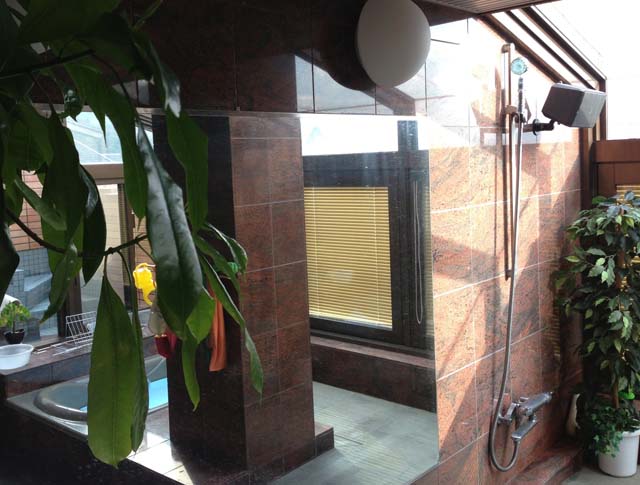デザイン事務所スタッフさんから現況写真を見せてもらったときはジャングル温泉かいな?と思うくらい立派なお風呂です。ガラス張りですし、リフォームの必要があるのか、半信半疑でした。