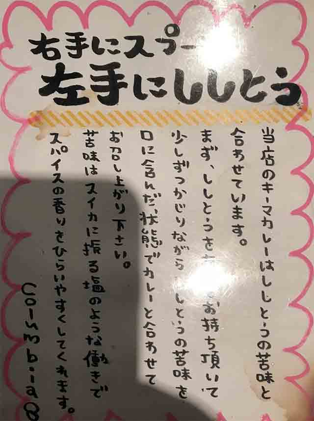 まず、ししとうを左手でお持ち頂いて少しずつかじりながらししとうの苦みを口に含んだ状態でカレーと合わせてお召し上がり下さい。